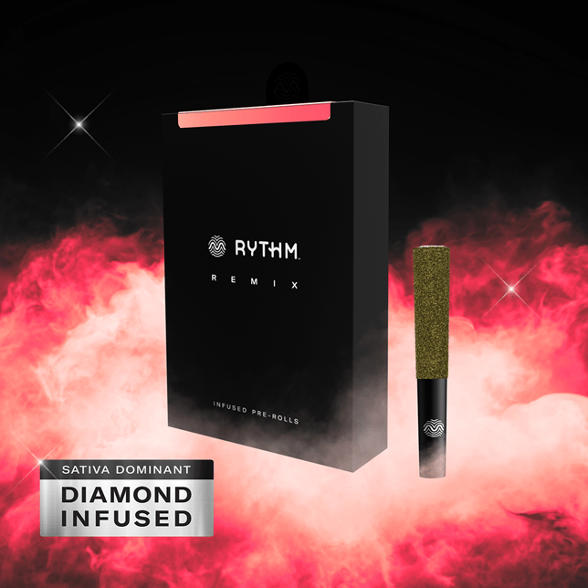 RYTHM Remix pre-rolls are built for those who want maximum potency and bold flavor in every session. Made with RYTHM Flower, each pre-roll is infused with live THCa diamonds for amped up potency, coated in kief for a double infusion, and fine-tuned with 100% natural terpenes for intense, fruit-forward flavor.