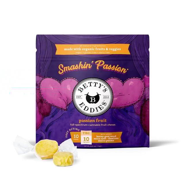Take Betty’s into the bedroom with Smashin' Passion! Infused with a blend of full-spectrum cannabis and natural aphrodisiacs, including horny goat weed, maca root, damiana & muira puama, these passion fruit chews are a sweet and romantic treat for you and yours. Chews passion, get pleasure!