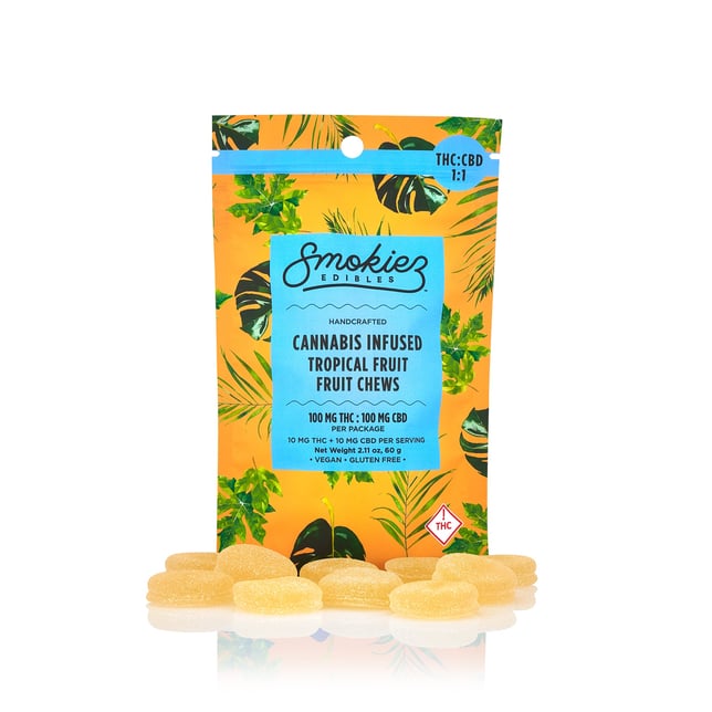 A harmonic blend of CBD and THC, Smokiez Tropical Fruit CBD:THC 1:1 Fruit Chews are NOT YOUR AVERAGE FRUIT CHEWS™ ;)